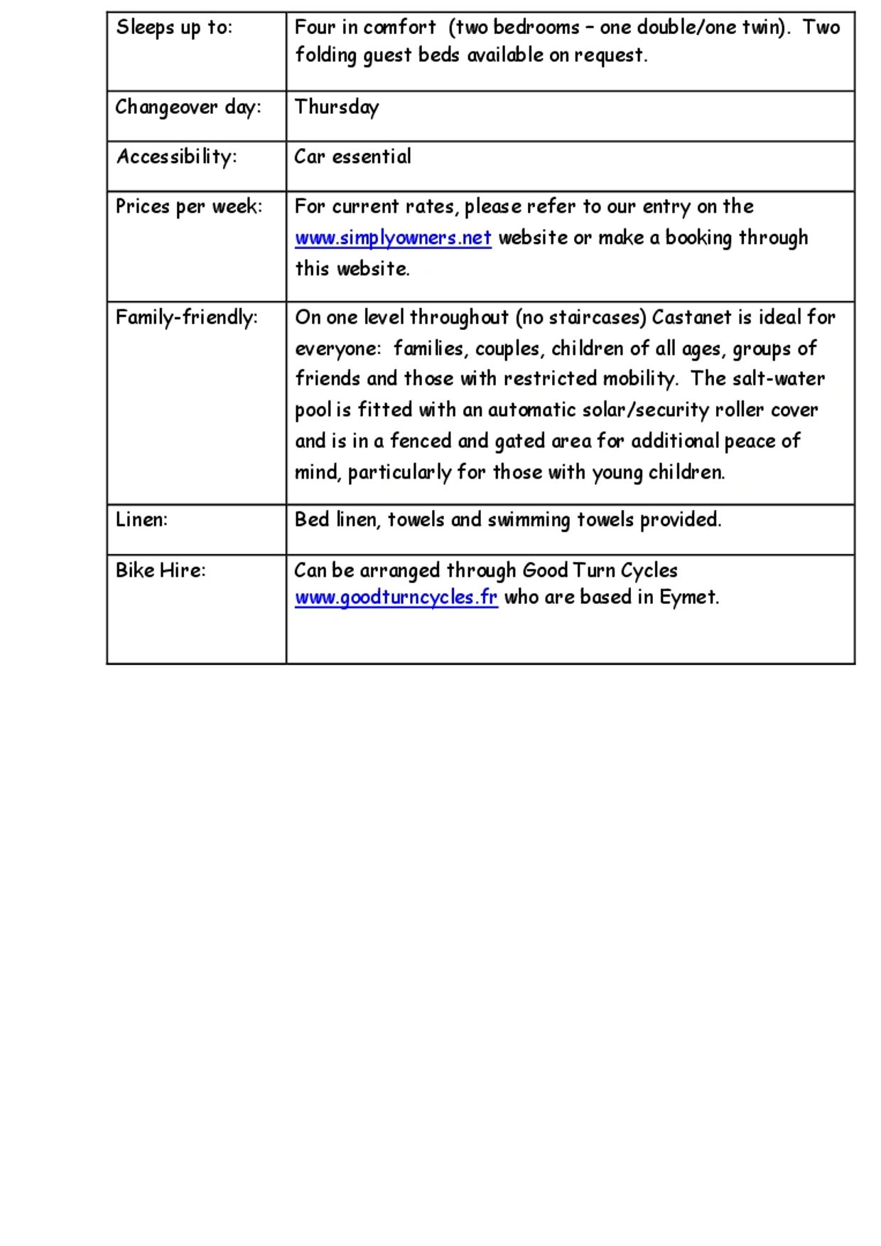 Castanet has been on the holiday rental market for over twenty years and has an excellent track record of repeat bookings. It is let direct by the UK-based owners and is maintained by an English management team.